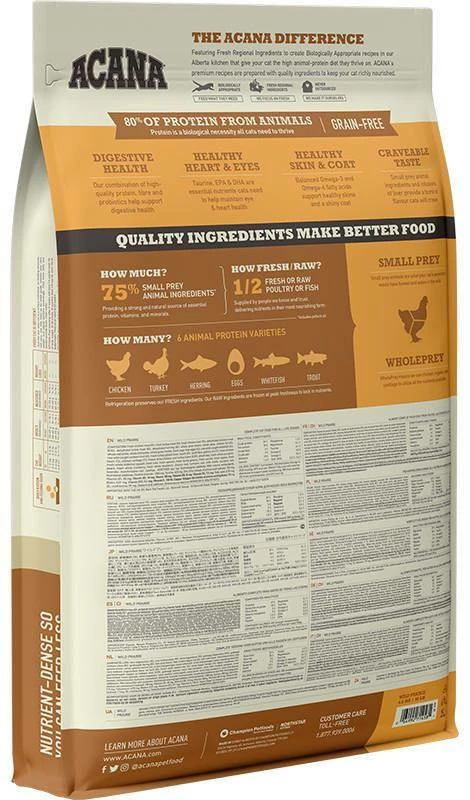 Les chats ont besoin d’un rĂ©gime riche en protĂ©ines animales. Ce besoin est dĂ©terminĂ© par leur constitution physiologique et leur nature carnivore. InspirĂ© par les vastes prairies canadiennes et les lacs vierges, ACANA Wild Prairie offre Ă votre chat des ingrĂ©dients d’origine animale de haute qualitĂ©, comme du poulet et de la dinde Ă©levĂ©s en libertĂ©, du poisson d’eau douce et des Ĺ“ufs d’Ă©levage en grange. Par consĂ©quent, ACANA est riche en protĂ©ines et en nutriments provenant de la viande musculaire, des organes internes et des cartilages et os prĂ©sents dans les proportions WholePrey de notre alimentation. Ainsi, votre chat reçoit tout ce dont il a besoin pour ĂŞtre en pleine santĂ©.