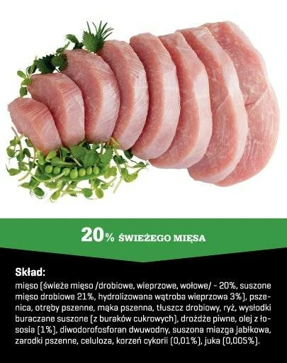 Viande (viande fraĂ®che /volaille, porc, bĹ“uf/ – 20%, viande de volaille sĂ©chĂ©e 21%, foie de porc hydrolysĂ© 3%)