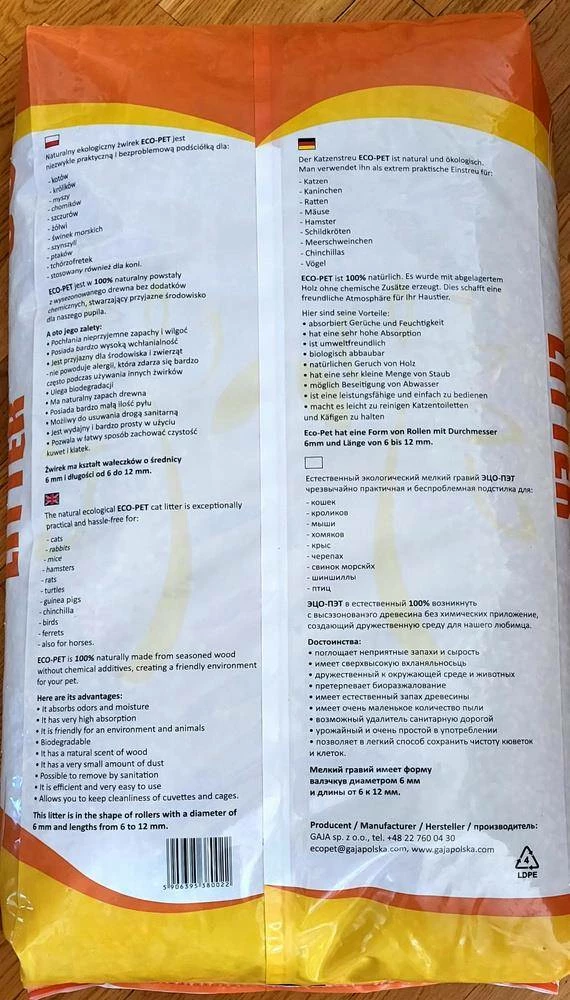 Gaja Eco-Pet est aussi bien une litière pour chats qu’une litière pour les petits animaux de compagnie. Il fonctionnera bien dans une cage avec des lapins, des souris, des hamsters, des rats, des cochons d’Inde, dans un bac à litière pour chat et dans un bac à litière pour furet et dans un terrarium avec des reptiles tels que les tortues terrestres. Il est également utilisé pour les chevaux.