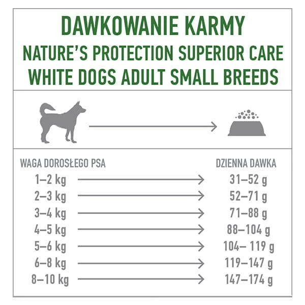 Pour de meilleurs résultats, nous vous recommandons de nourrir votre chien uniquement avec Superior Care White Dogs, car d’autres aliments peuvent affecter le brunissement du pelage et dans ce cas, vous ne verrez pas les résultats souhaités.