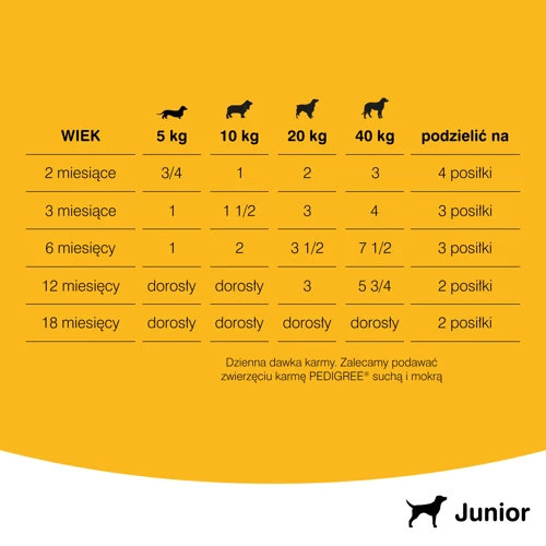 Grâce à l’excellent goût du poulet, Pedigree Junior deviendra instantanément le repas préféré de votre chien. En donnant Pedigree Junior à votre animal, vous pouvez être sûr que vous lui fournissez les ingrédients nécessaires à un départ sain, de manière délicieuse.