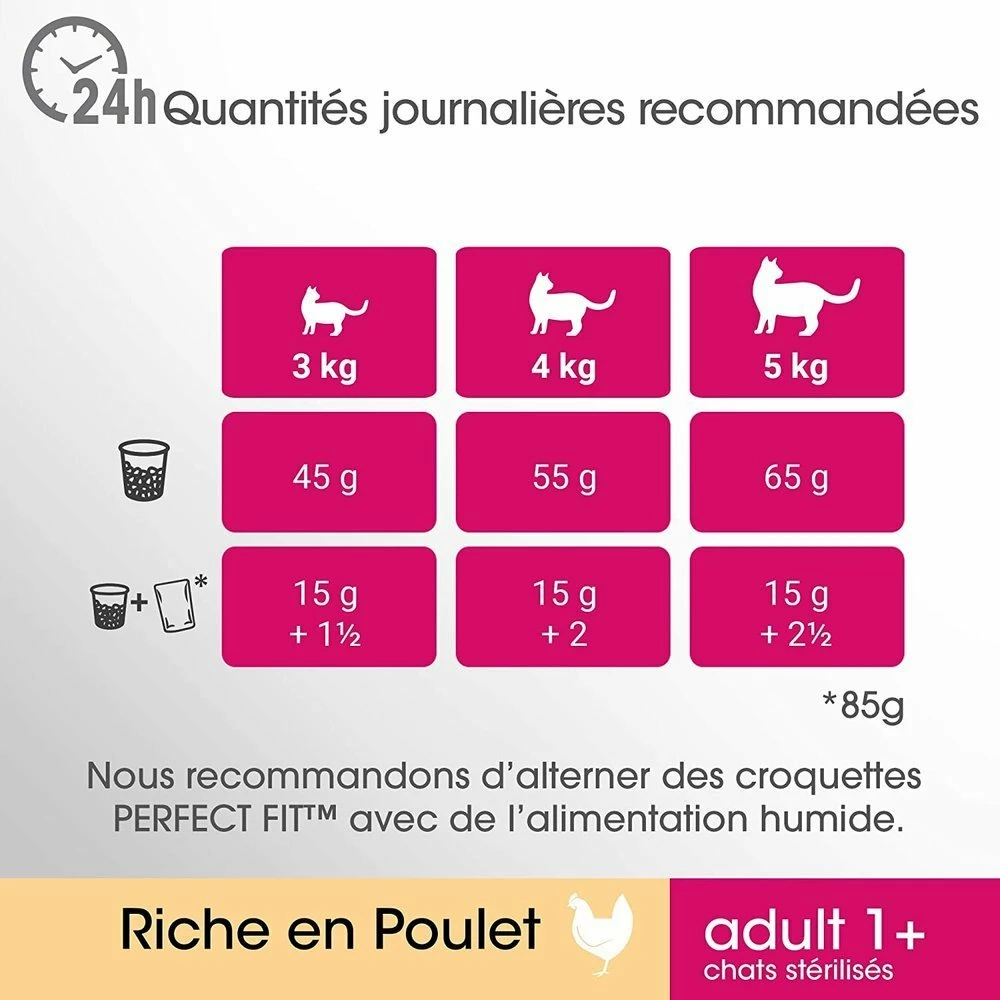 Un chat de 3 kg a besoin de 45 g de nourriture sèche ou de 15 g de nourriture sèche et de 1½ sachet de nourriture humide par jour.