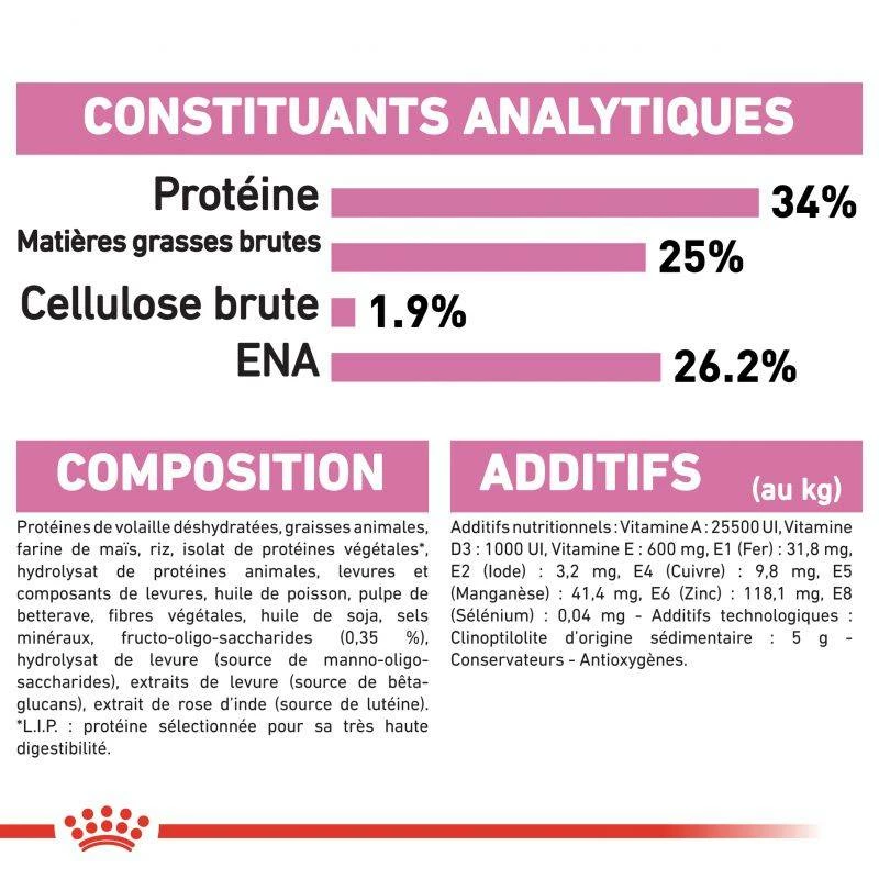 ROYAL CANIN British Shorthair Kitten est un aliment spécialement formulé pour les chatons British Shorthair afin d’assurer un développement correct et harmonieux du chaton. Le système immunitaire du chaton n’est pas complètement développé et a donc besoin d’être soutenu par les bons nutriments. Le complexe breveté d’antioxydants en interaction, y compris la vitamine E, favorise le développement des mécanismes de défense naturels. Le système digestif du chaton continue de se développer jusqu’à l’âge de 12 mois. Des protéines de haute qualité sont importantes pour la santé du tube digestif, c’est pourquoi l’aliment contient des protéines L.I.P., sélectionnées pour leur très haute digestibilité. Il contient également des prébiotiques pour aider à équilibrer la flore intestinale.