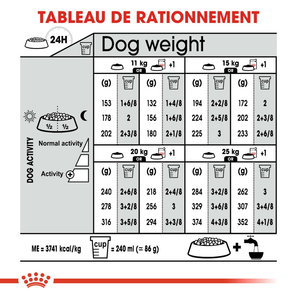 | Poids du chien | Faible activité (nourriture sèche) | Faible activité (alimentation mixte) | Activité normale (alimentation sèche) | Activité normale (alimentation mixte) | Activité élevée (alimentation sèche) | Activité élevée (alimentation mixte) |