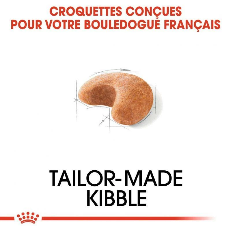 La croquette spécialement conçue permet aux bouledogues français de saisir plus facilement la nourriture et les encourage à la mâcher.