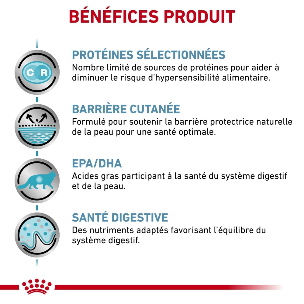 Aliment diététique complet pour chats adultes au goût de poulet. L’aliment est formulé pour réduire le risque d’intolérance alimentaire. Contient des sources sélectionnées de protéines et de glucides.