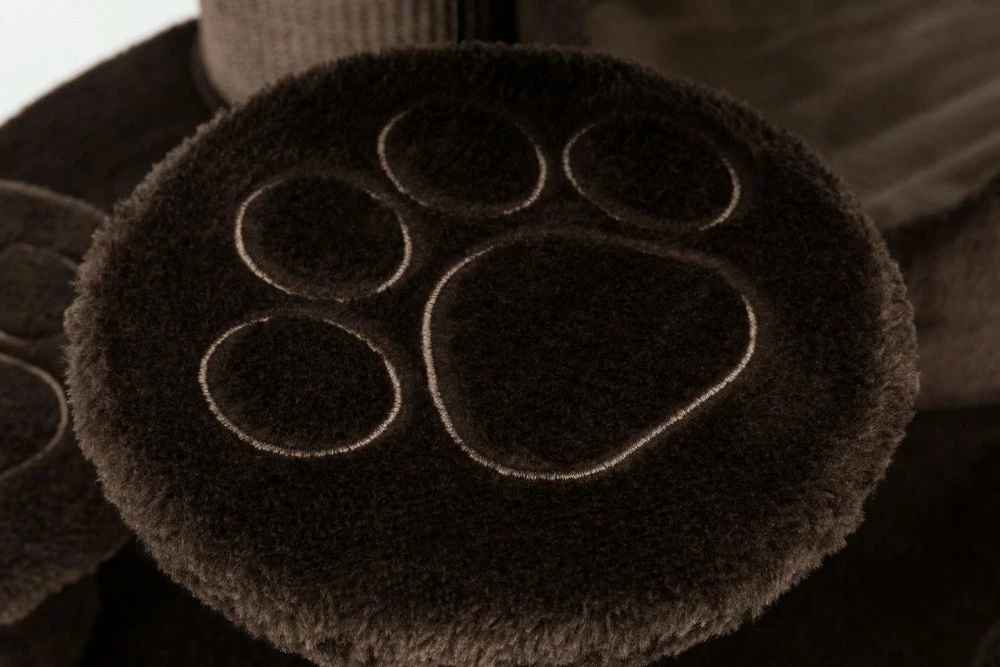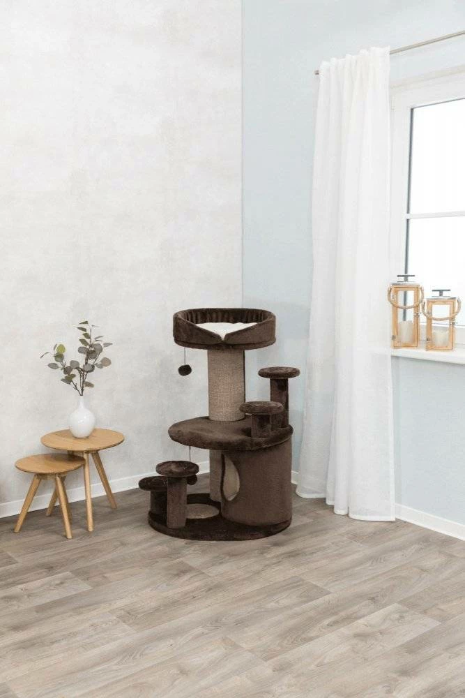 Grattoir pour chat sur pied Emil avec rembourrage en peluche. Le poteau est enveloppé dans du sisal naturel. Il dispose de 4 marches rembourrées avec broderie et d’un lit avec un coussin à double face. Plate-forme avec lit amovible. Avec un jouet sur une ficelle.