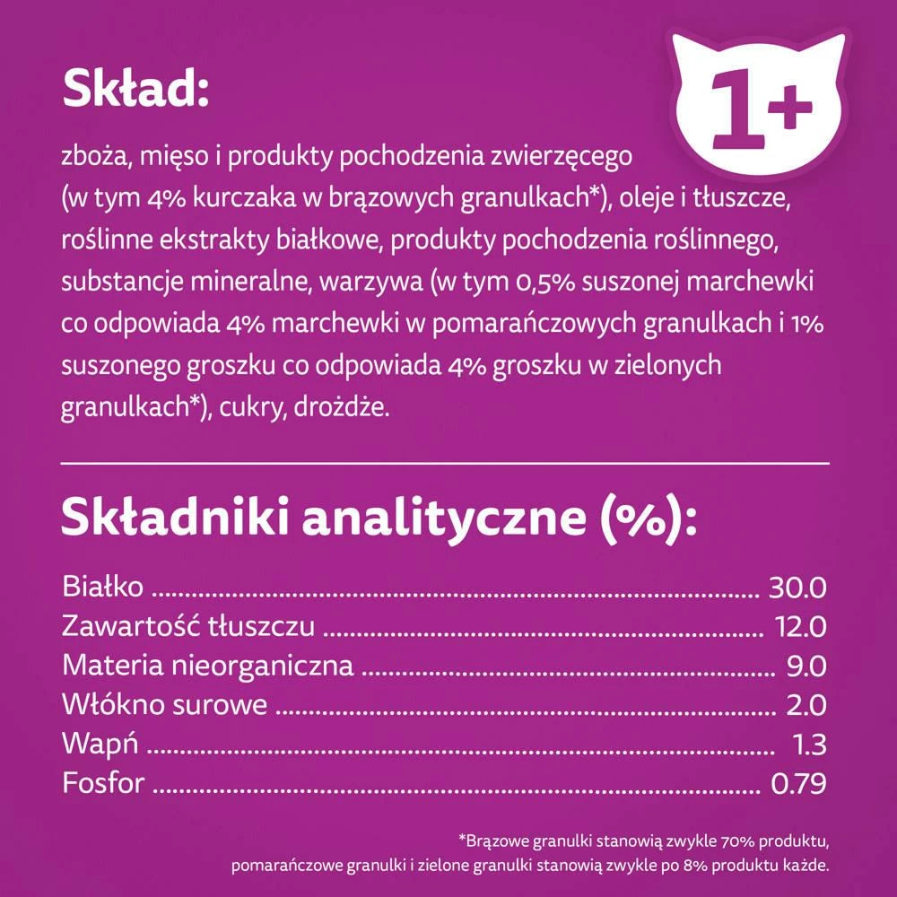N’oubliez pas d’inclure les calories des friandises. Les quantités de nourriture sont données à titre indicatif. Adaptez la quantité de nourriture en fonction de l’âge, de la taille et du niveau d’activité de votre chat. Divisez-les en portions pour les nourrir tout au long de la journée. Lorsque vous changez de régime alimentaire, introduisez la nourriture progressivement. Pour plus d’informations, visitez notre site web à l’adresse www.whiskas.pl ou appelez notre service d’assistance téléphonique au 0-801 10 63 63. Fournissez de l’eau fraîche à boire. Conserver dans un récipient fermé dans un endroit sec et frais. Conservez l’emballage hors de portée des enfants et des animaux. Une utilisation incorrecte risque de provoquer une suffocation.